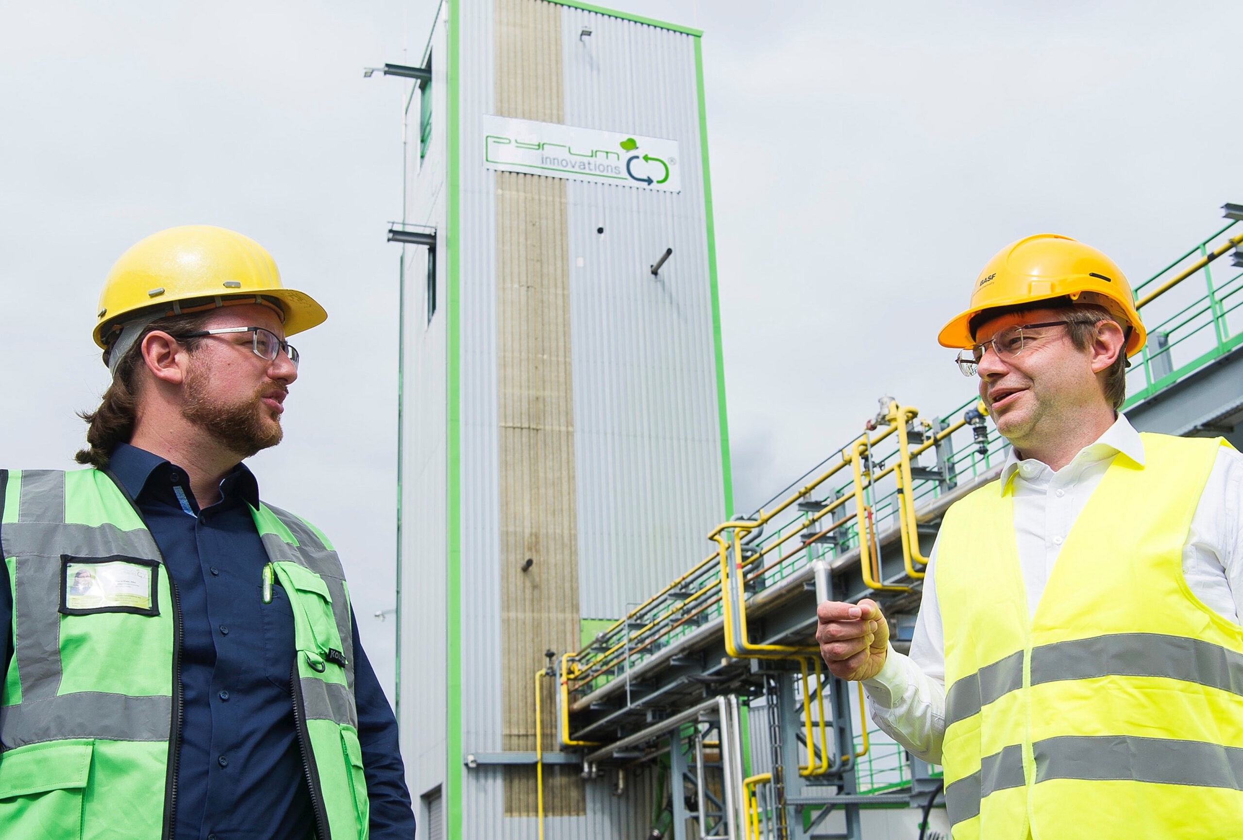 Pascal Klein (links), Gründer und CEO von Pyrum Innovations, und Dr. Christian Lach (rechts), Projektleiter Chemcycling bei BASF, vor der Reifenpyrolyseanlage von Pyrum in Dillingen/Saar (Quelle: BASF)