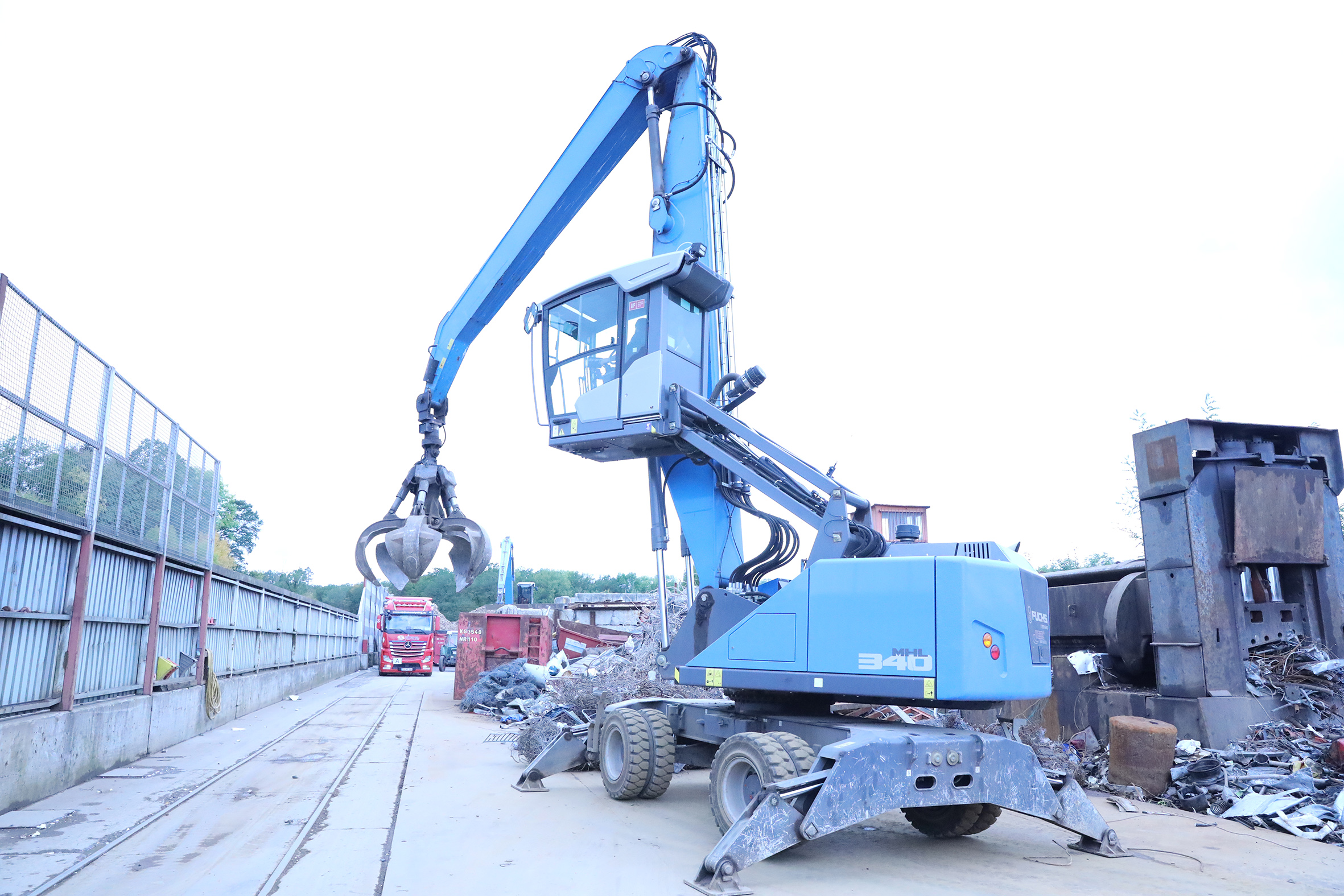 Aus der Presse geht der Altschrott direkt in den LKW – die eingebaute Waage meldet dem Baggerfahrer, wann das zulässige Gesamtgewicht erreicht ist. Bild: Jasmin Hanf