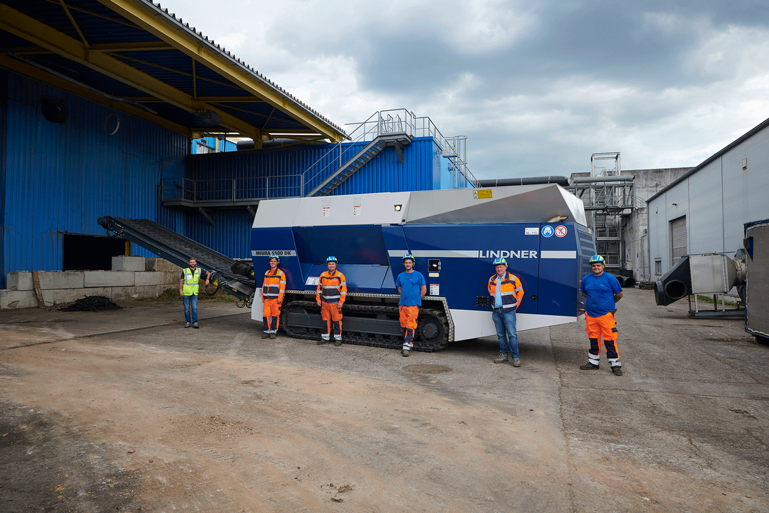 Lindner Sales Manager Clemens Jäger (1.v.l.) mit dem Team der LINZ AG rund um Betriebsleiter Franz Grottenthaler (5.v.l.) bei der Inbetriebnahme des neuen mobilen Schredders Miura 1500 DK. Bild: Lindner Recyclingtech