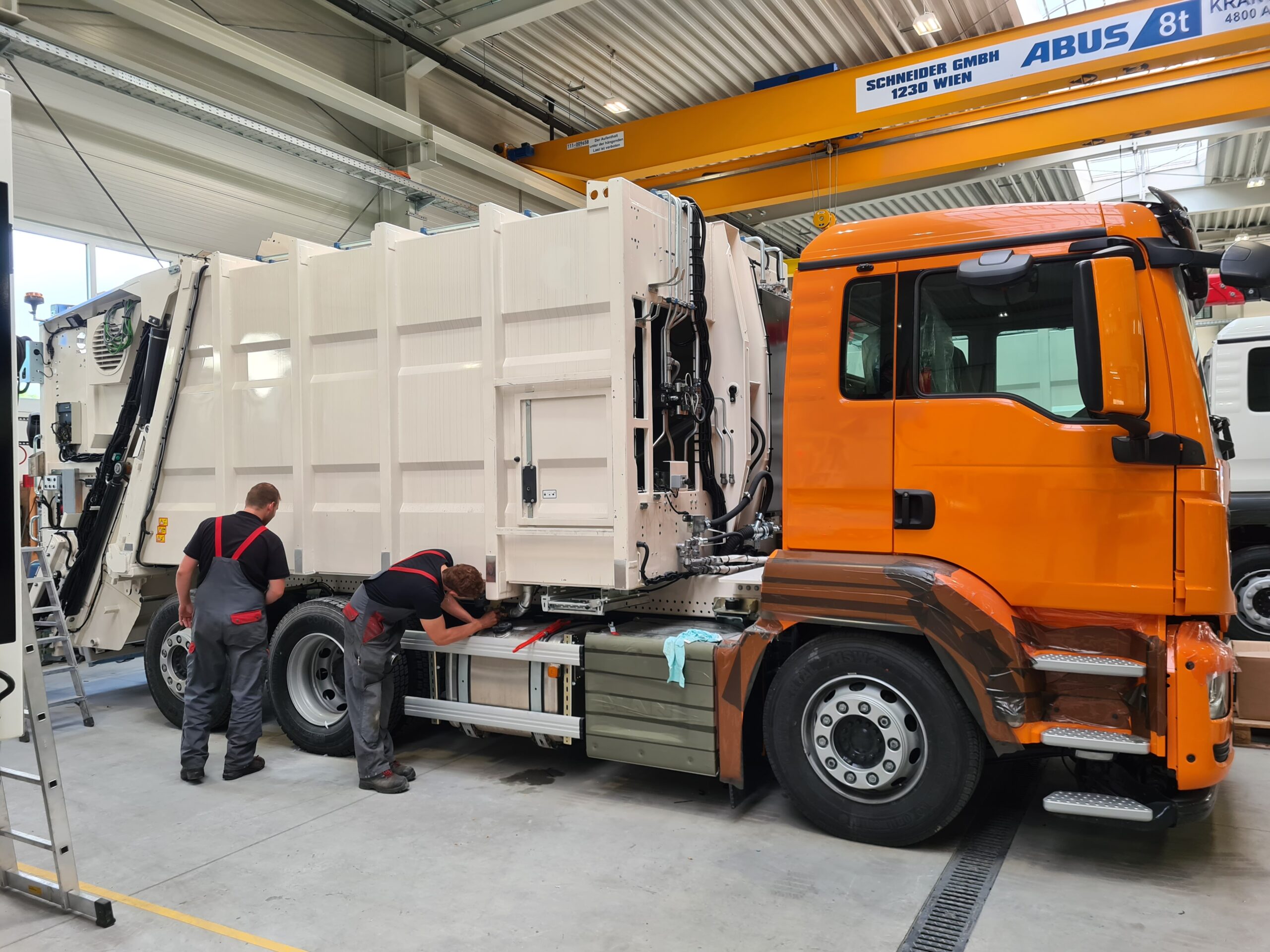 Aufbau der Fahrzeuge bei Stummer Kommunalfahrzeuge in Bischofshofen, Österreich. Die neuen Müllfahrzeuge wurden unter anderem mit einer Absaugvorrichtung am Heck ausgestattet. Bild: Stefan Neumayer, Stummer Kommunalfahrzeuge