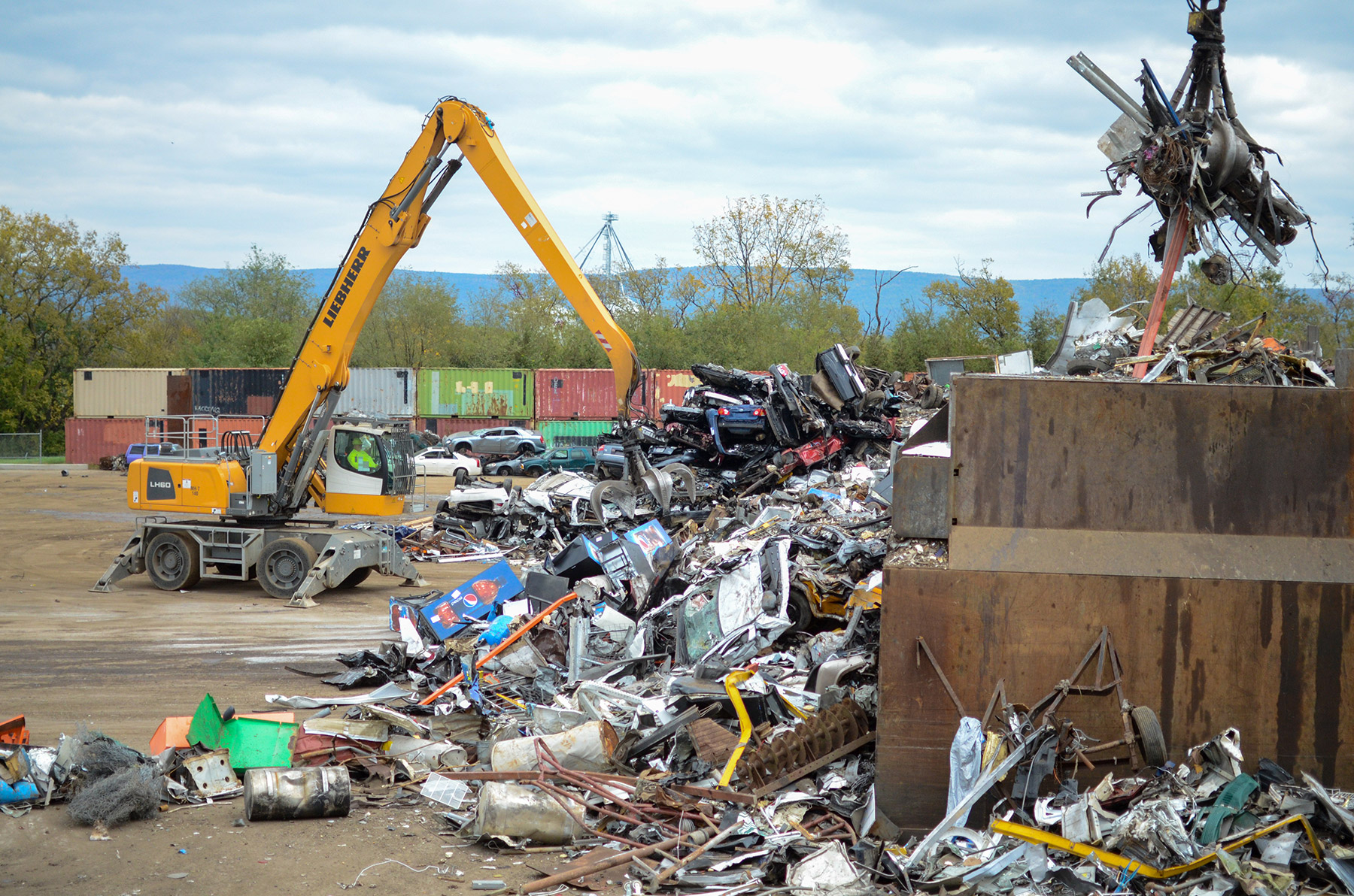 Ausgestattet mit Zweischalengreifer und Magnetsystem: Der Sennebogen 825 E bei Cometfer, be-reit für den Umschlag von Schrottmaterialien aller Art. Copyright: Lisa-Maria Heigl