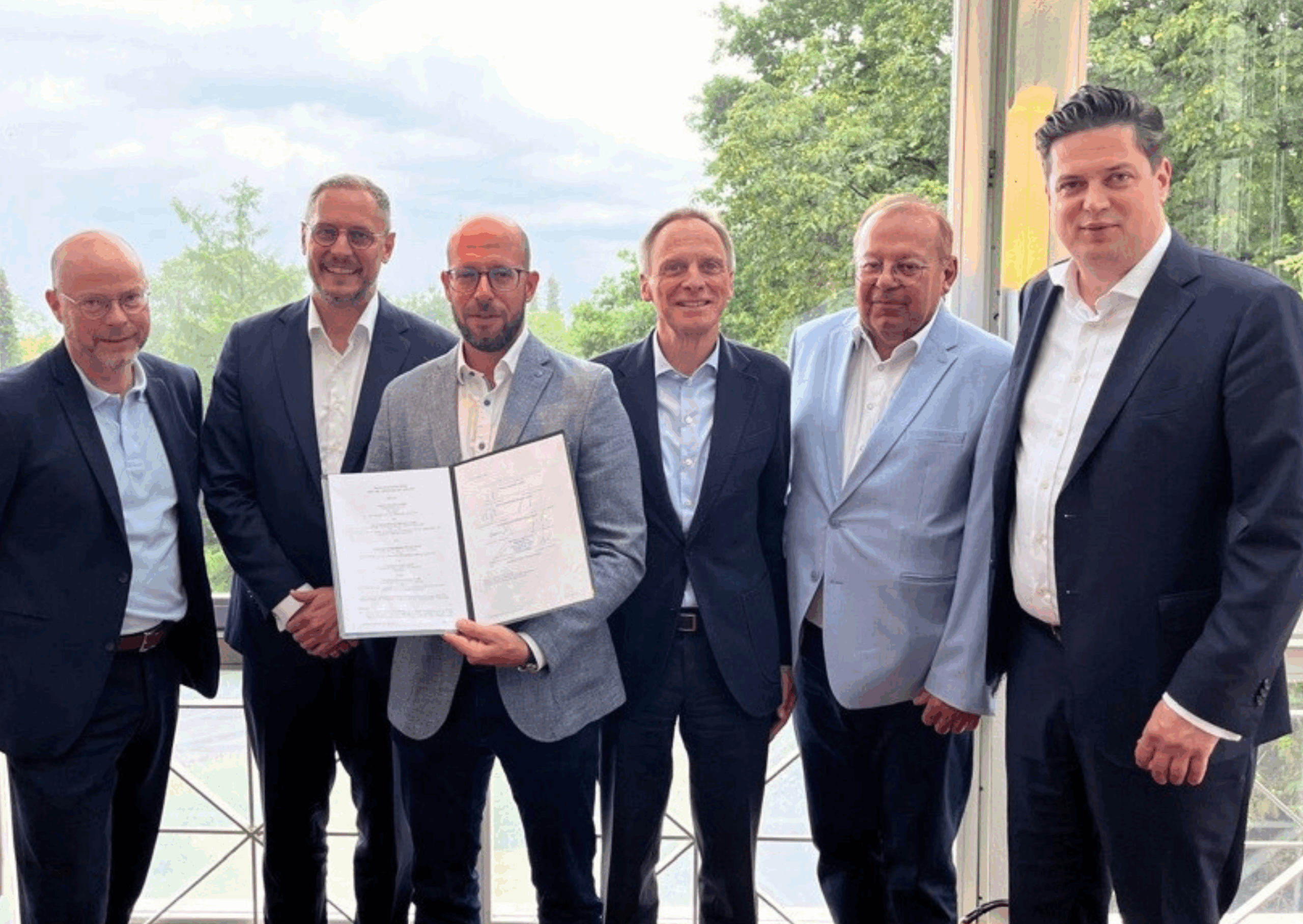 Christian Presslmayer (Geschäftsführung voestalpine Rohstoffbeschaffungs GmbH), Denis Reuter (COO TSR Group), Christoph Priemetshofer (Director Scrap & Refractories Voestalpine Rohstoffbeschaffungs Gmbh), Hans Neumüller (COO Johann Neumüller Gesellschaft m.b.H.), Ulrich Althoff (COO AAA Stahl Holding GmbH) und Christian Thielen (CFO TSR Group) (v.l.n.r.) haben die langfristige Liefervereinbarung zwischen der TSR Group und voestalpine zur Versorgung mit hochwertigen Recyclingrohstoffen unterzeichnet. Copyright: TSR