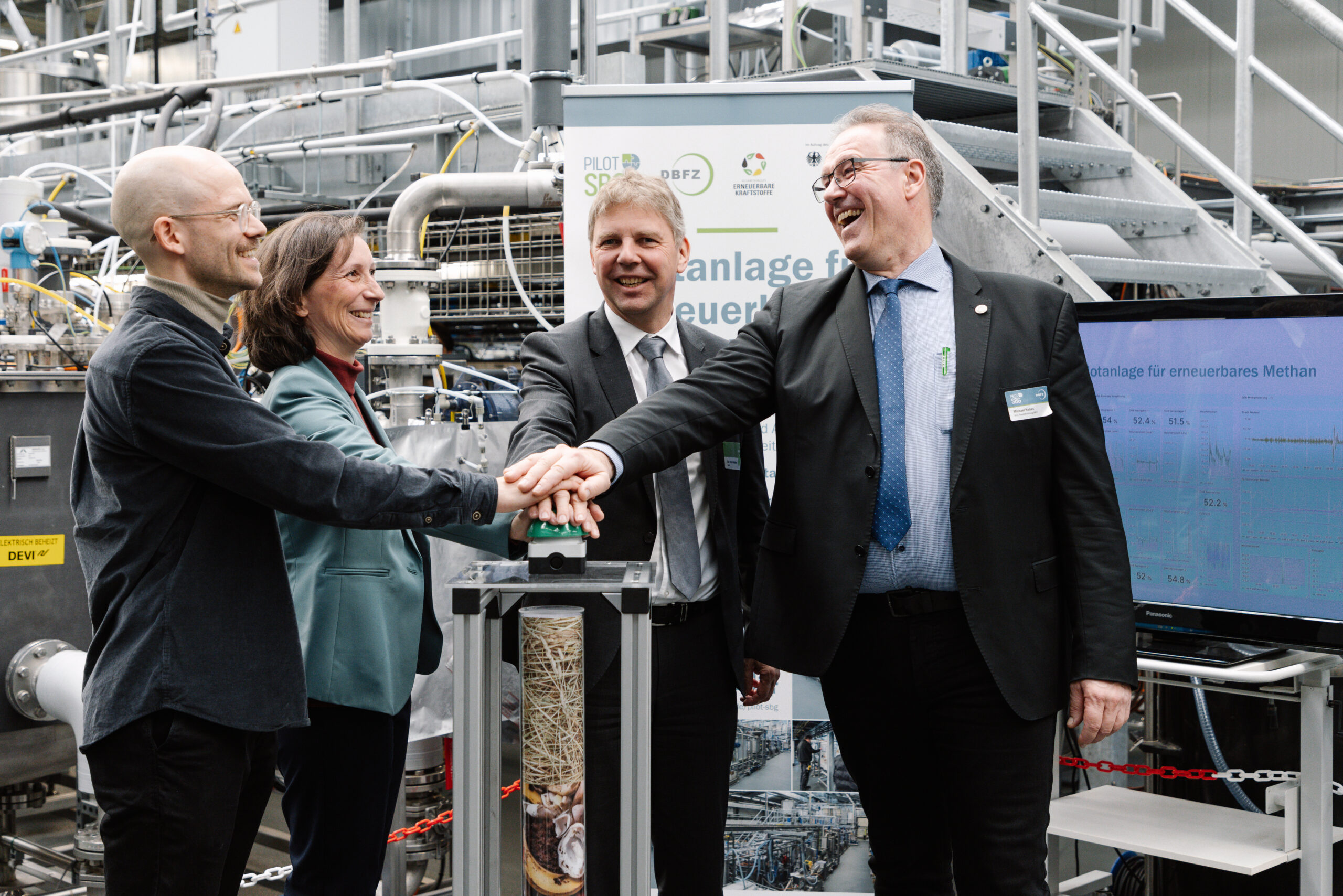 Offizielle Inbetriebnahme der neuen Forschungsanlage für erneuerbares Methan: Philipp Knötig, Karin Naumann (Projektleitung), Dr. Sven Halldorn (BMDV), Prof. Dr. Michael Nelles (Wiss. Geschäftsführer DBFZ), v.l.n.r. Copyright: DBFZ