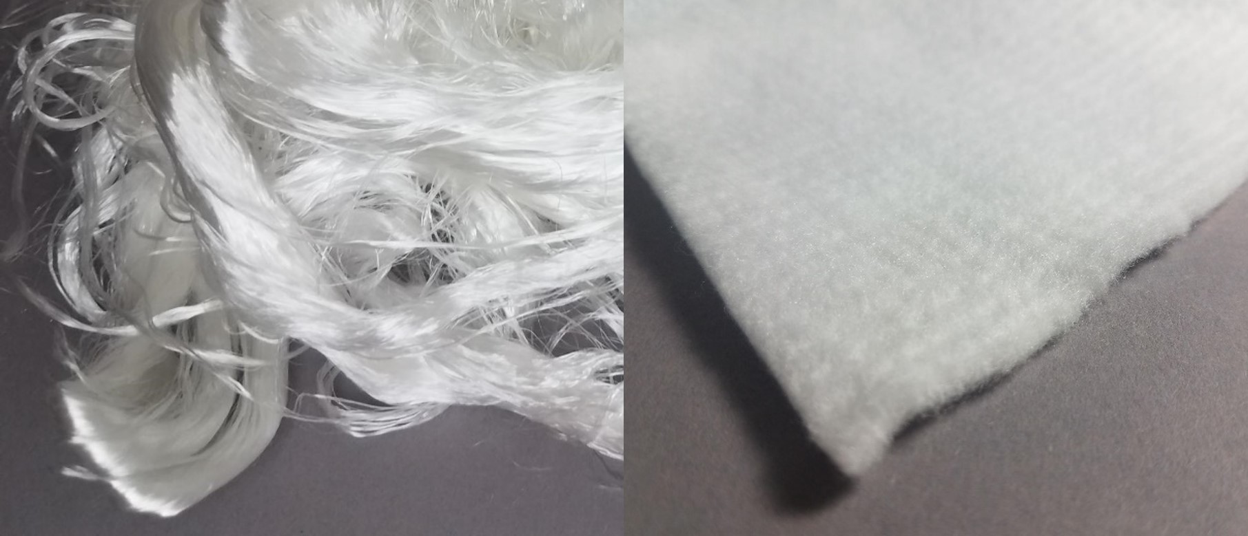 PLA-Fasern (links) und PLA-Vlies (rechts) aus 100% rezykliertem PLA. Copyright: TCKT