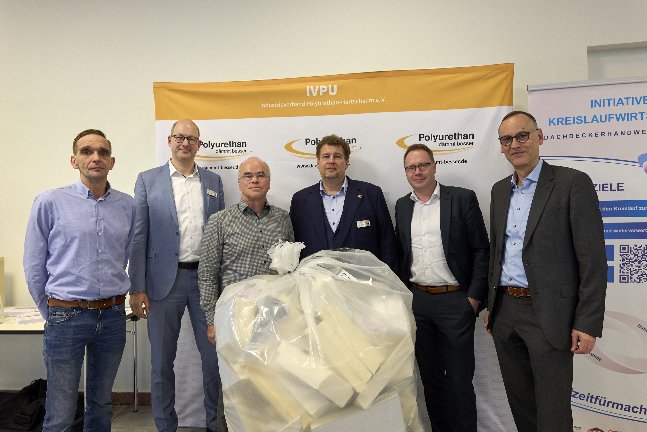 Gruppenbild mit Sammelsack: (von links) Ronny Ehrhardt, FA Erich Weit | Sebastian Bobinski, Geschäftsführer DDI Berlin | Silvio Schlickeisen, FA DWF | S. Ziemann, Landesinnungsmeister DDI Berlin | P. Witte, ZVDH | T. Schellenberger, IVPU. Copyright: IVPU/ZVDH
