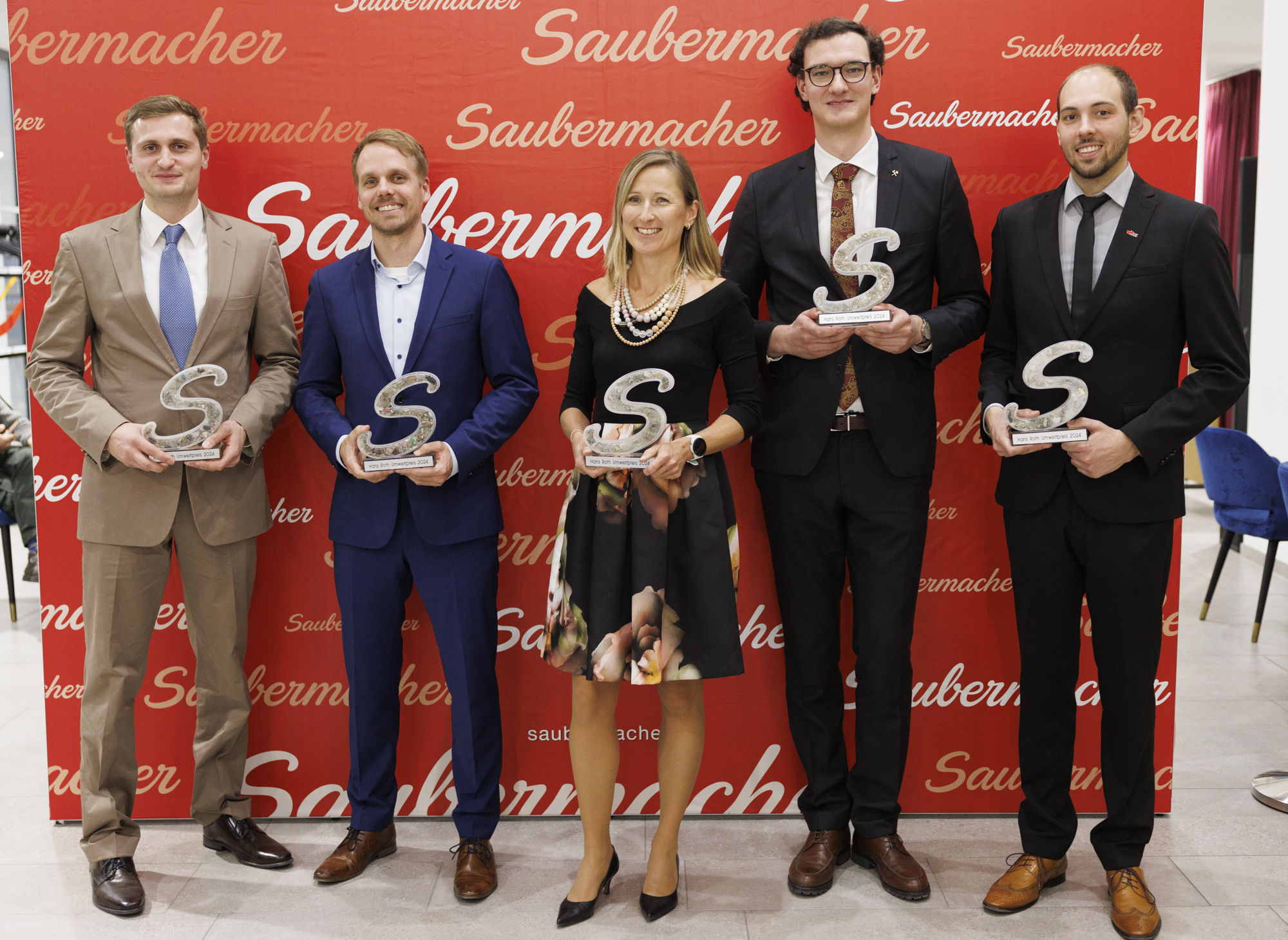 (v.l.n.r.): Gerald Lang, BOKU Wien; Dominik Blasenbauer, TU Wien; Zusana Zavodsky, Do-nau-Uni Krems, Paul Demschar, Montanuniversität Leoben; Alexander Wagner, TU Graz. Copyright: Saubermacher/Scheriau