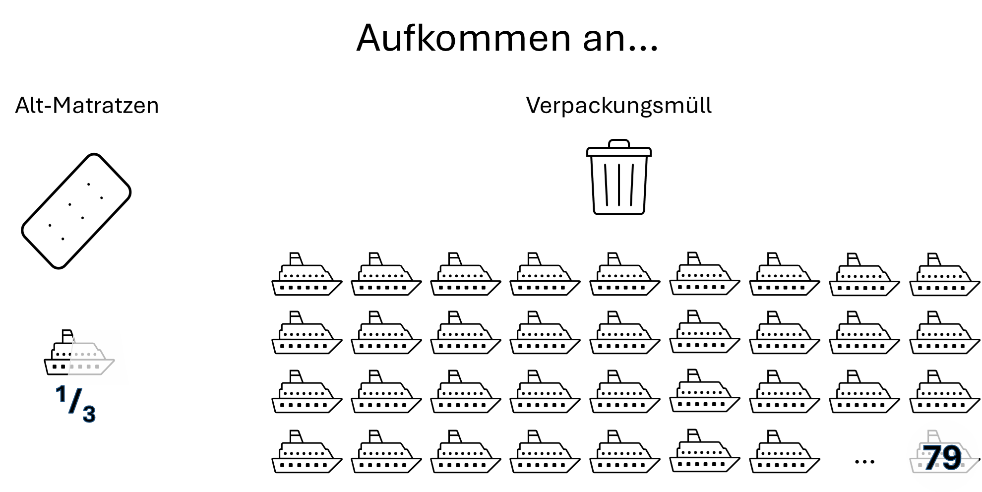 Die Icon of the Sea ist mit einem Gewicht von 250.000 Tonnen das weltweit größte Kreuzfahrtschiff und hilft, verschiedene Abfallströme zu visualisieren: 93.000 Tonnen alter Matratzen entsprechen gut einem Drittel eines solches schwimmenden Riesens (37 %). Das Aufkommen an Verpackungsmüll dagegen entspricht 79 Kreuzfahrtschiffen. Copyright: Fachverband Matratzen-Industrie