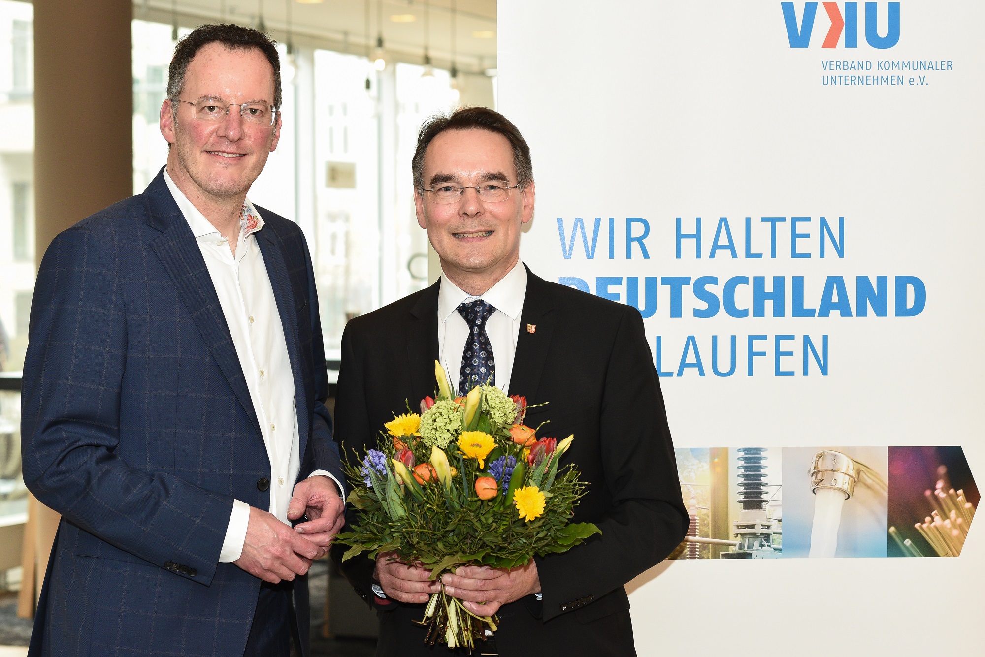 VKU-Präsident Michael Ebling gratuliert Ingbert Liebing, dem neuen VKU-Hauptgeschäftsführer.